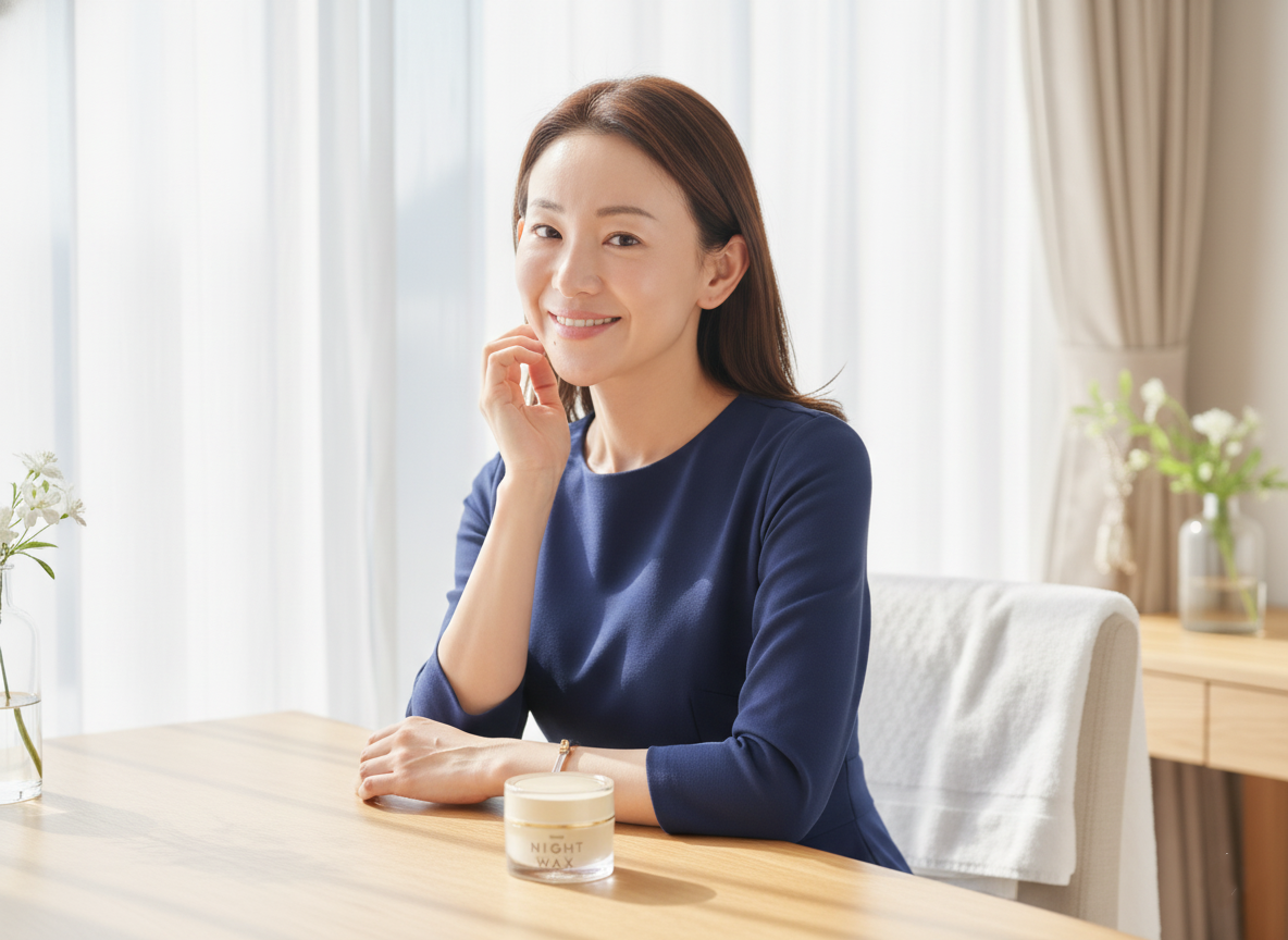 年齢とともに肌のハリが気になっていましたが、娘からNight Wax のことを聞き試してみました。少し固めの質感で、引き上げるように塗っていくと、肌が留まる感じに驚きました。朝起きるとクリームが少し⽩っちゃけていましたが、洗顔ですぐに落ちました。クリームを落とすと何だか顔に透明感が出た感じがしました。しばらく続けてみます。