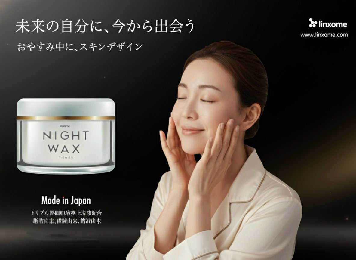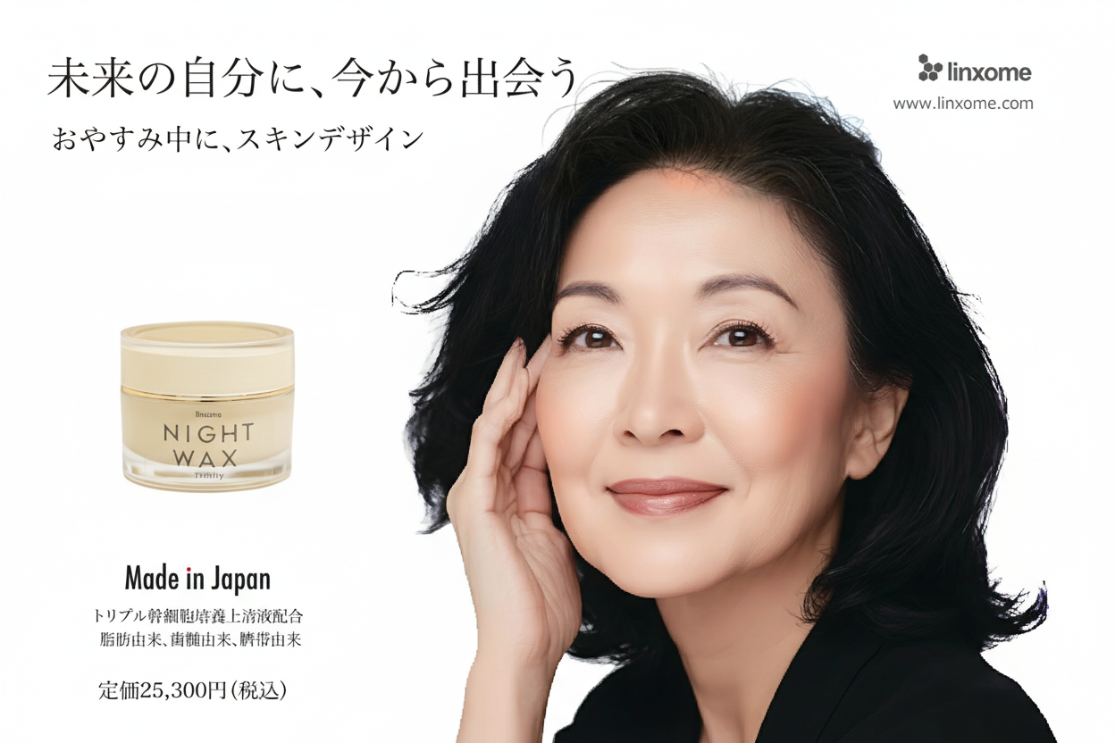 Linxome社が取り扱う、医療機関でも採用される品質の国産幹細胞培養上清液(脂肪由来・歯髄由来・臍帯由来)を三種配合した、夜用フェイスワックスです。エイジングケアに寄り添い、顔立ちを整える化粧品です。